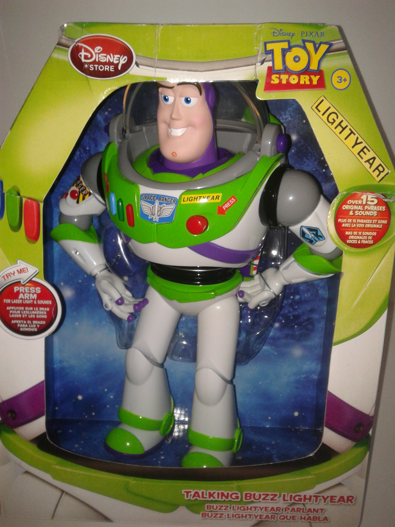 Базз при нажатии на кнопку издает 15 фраз голосом оригинала,ноги ,руки и пальцы сгибаются.На правой руке "лазерное оружие" (звук,луч),крылья складываются(огоньки мигают),имитация удара "карате"(звук,движение).